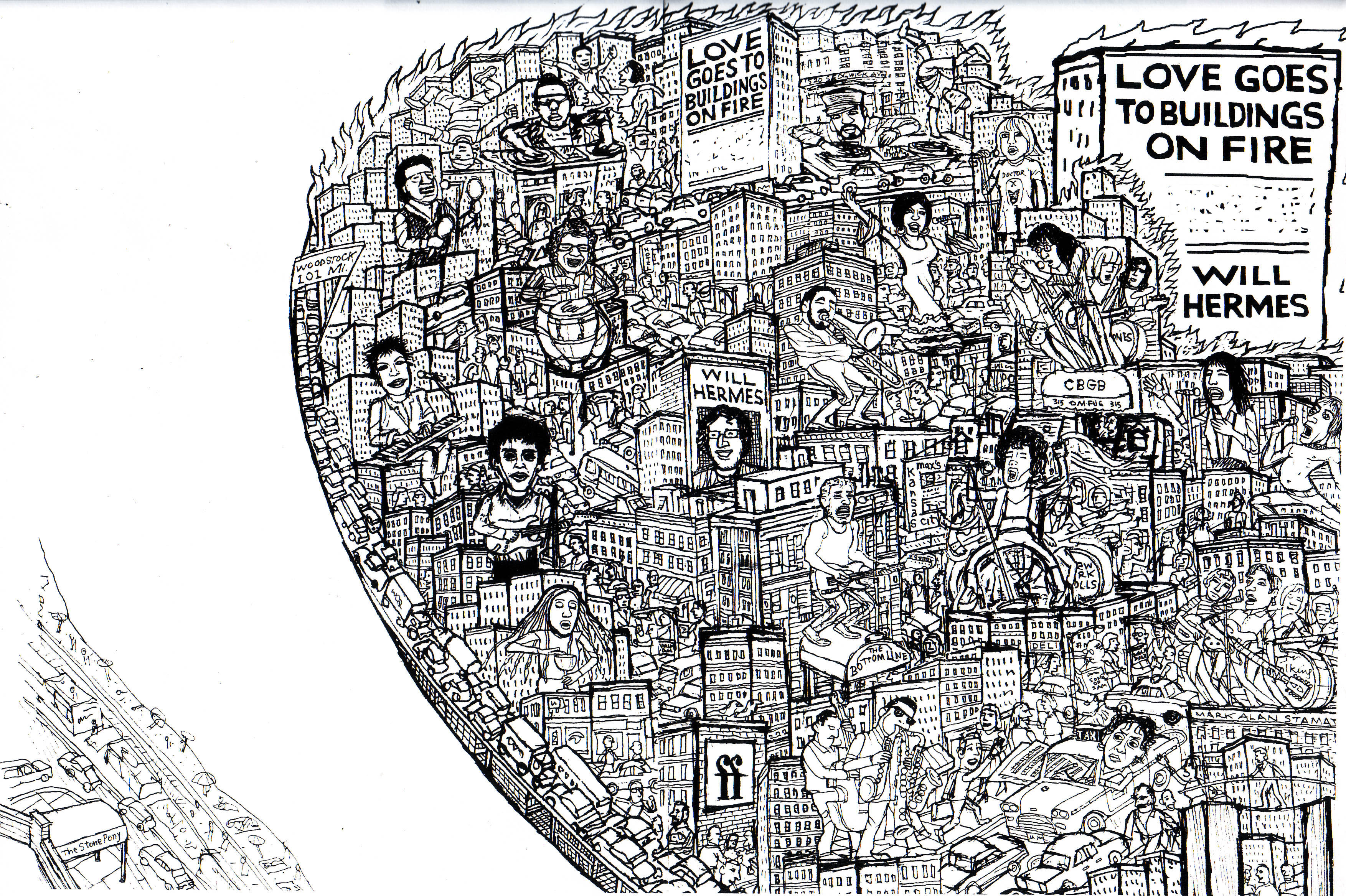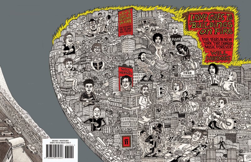 I tried to imagine a cover for Love Goes To Buildings On Fire as I was writing it, but it was tough to fix on a single image that would represent the full scope of the thing, and I hated the idea of a photo collage. The best I came up with was a photo by Martha Cooper—who shot for the New York Post beginning in the late ’70s—of a kid playing trumpet alongside some ruined Manhattan piers. But she’d already used it for the cover of her own book, New York State Of Mind.