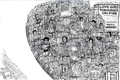 What they asked me to do for this cover was to work in the sort of “map” style of those posters and place some of the musicians discussed in the Will Hermes’s book. So, first off, I had to decide which musicians to include based on what was given to me to choose from. I read a long excerpt of the manuscript to get the feel of the book and I sought out visual references at the library and on the internet.