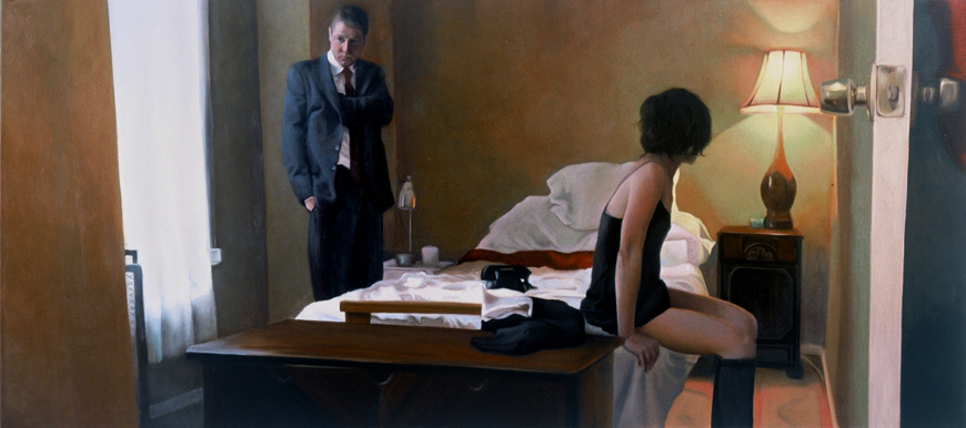 It’s been awhile since I painted “Bed,” but I remember at that time I was interested in creating something of a “false narrative” or the effect of creating a misunderstanding that something was happening when it wasn’t. I simply put two friends in “costume” and had them awkwardly move around a bedroom and watched as their awkwardness created a story.