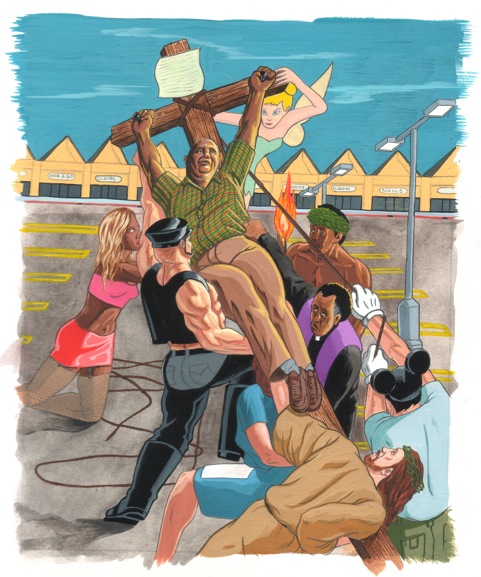 He and James did a lot to push my hazy high-concept mashup toward actual realization. James was deeply involved throughout, pushing us to go bigger, tackier, trashier. (One note from him reads, “Hey Eli. Can one of the figures hoisting Gary onto the cross be Mickey Mouse, dressed as the Sorcerer’s Apprentice?” Another: “In an ideal world, the fire dancer would look a lot more like Mario Lopez.”)