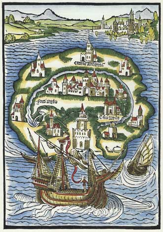 No matter what cover I’m given, there will always be an initial period of panic because whatever my designers come up with will (of course!) not match the image I held in my mind for years and years. For Arcadia, I’d decided the cover would be an updated version of the frontispiece of Sir Thomas Moore’s Utopia: woodcut-like, but with a brick Arcadia House in the center and maybe a caravan in the place of the boat.