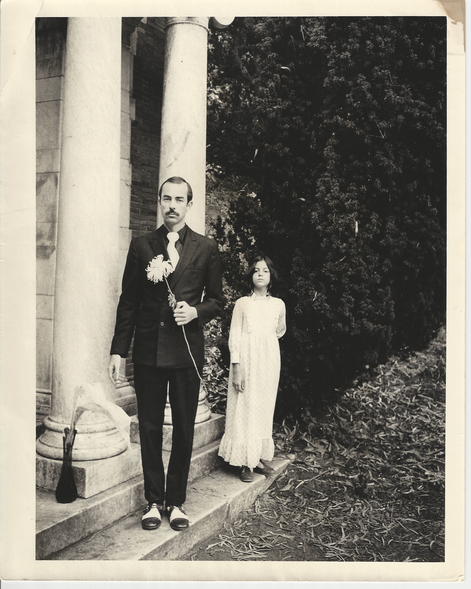 This photograph of my dad and I, taken in front of a pair of marble arches in Golden Gate Park, has long been my favorite of us. I was ten years old when he took me out of school for the day to pose for a series of pictures he’d hoped would be the front and back cover of his third book of book of poetry, Stretching the Agape Bra. The photographer friend, who agreed to shoot us, asked us to wear our finest clothes, ideally in black and white. Because I had no nice dresses, I borrowed this high-necked prairie dress from my friend, Kathy Moe, the daughter of one of Dad’s poet friends. As you can see, the dress was too short in the arms and for most of my life, whenever I looked at this picture, I thought, There’s the girl with the monkey arms. But now I realize that my too-short dress, along with Dad’s pinstripe suit and two-tone shoes, are part of what makes this image work. Standing with such formality in our ill-fitting finery, Dad and I look like a pair of Depression-era tricksters, like Bonnie and Clyde or Ryan and Tatum O’Neal in Paper Moon.