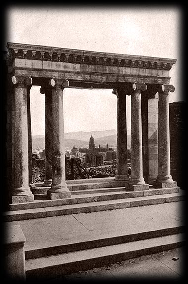 It was only in writing the book that I learned the history of the marble portico that is our backdrop. In 1906, a devastating earthquake struck San Francisco, taking 3,000 lives and sparking fires that destroyed 80% of the city. A photograph of a marble portico, the remains of a great Nob Hill mansion with the city smoldering in the background, became the defining image of that disaster.